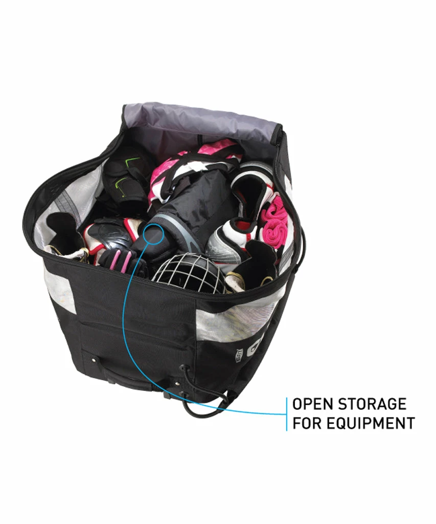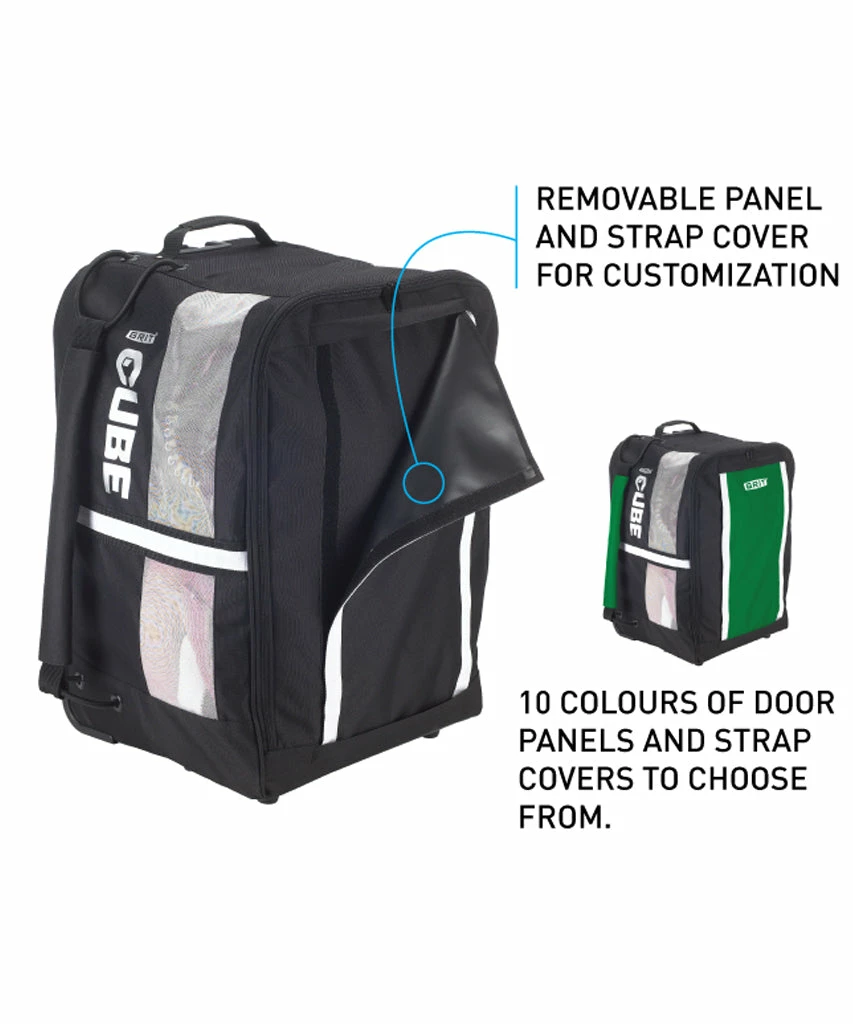 The perfect shape for a hockey bag is a CUBE, because it stacks & packs. The GRIT Cube Jr sports a pro shape that can be wheeled or carried. The bag is available in black 600 D polyester accentuated by silver mesh vents. The Grit Cube Accessory Pack features removable coloured panels and strap covers allowing you to customize your CUBE in ten (10) colour combinations – accessory packs are sold separately.