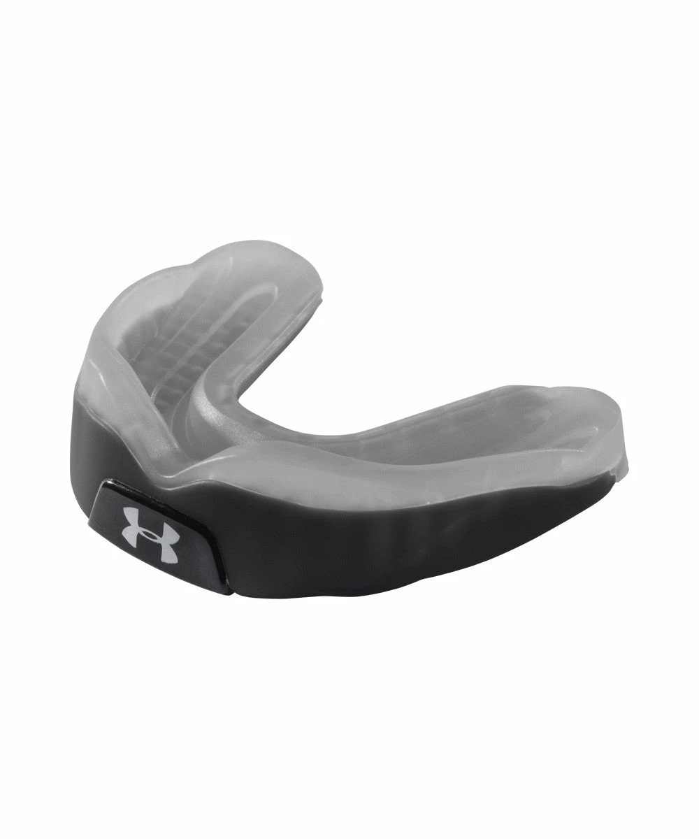 Under Armour ArmourShield™ FlavorBlast mouth guards are designed for all contact sports and the FlavorBlast embedded flavor beads deliver long lasting taste. ArmourShield™ technology uses patented Bite Flex™ and ArmourPlate™ to provide higher-impact protection to the teeth, jaws and gums. The ArmourPlate™ insert delivers improved protection while the Bite Flex™ absorbs energy on impact. The patented Polymer Shrink provides the ability to breathe and talk easily. This mouth guard features a convertible strap/strapless tether and is latex-free.